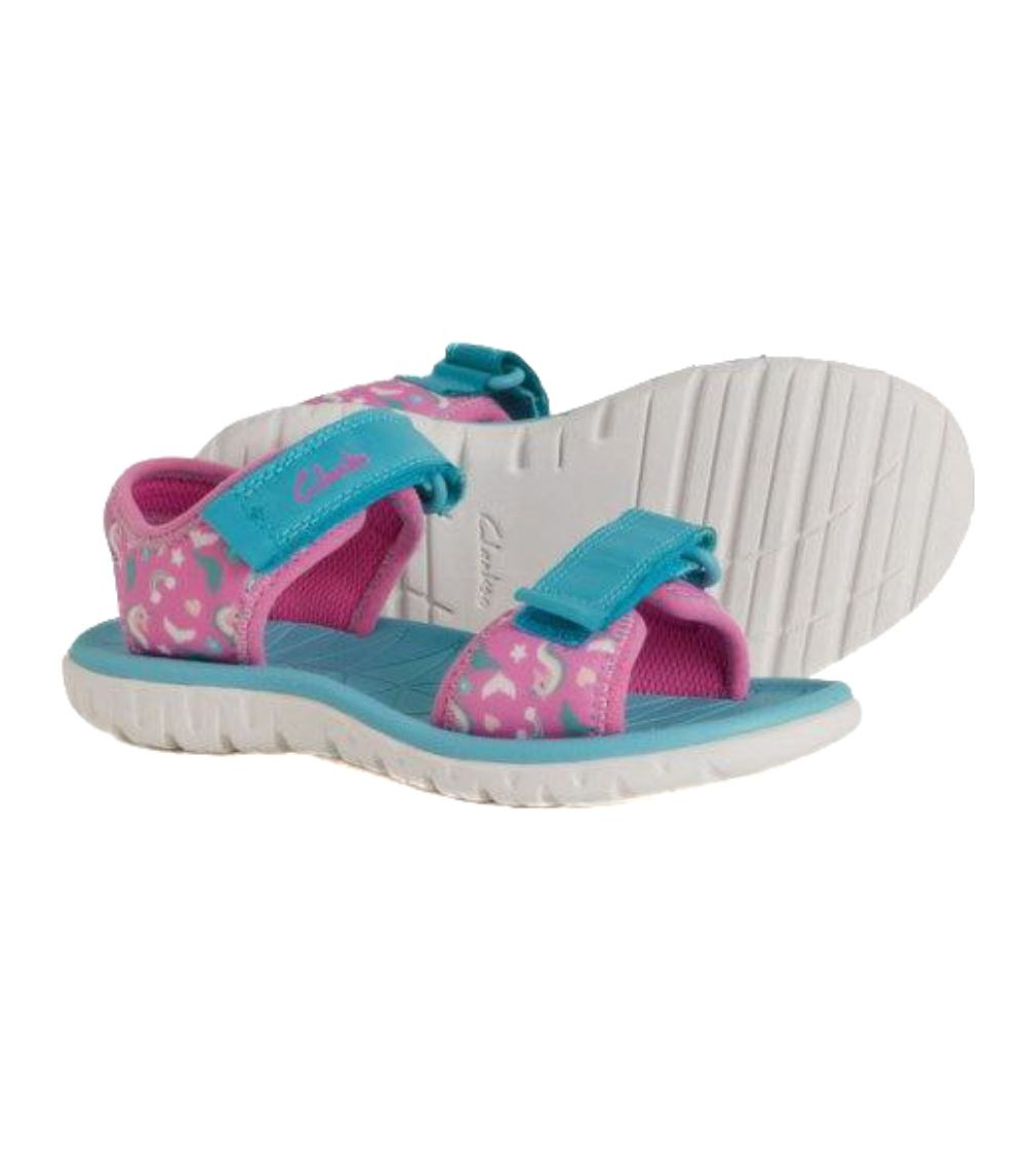 • Clarks Surfing Tide ідеально підходять як для відпочинку біля басейну, так і для пікніків. Поєднання милий дизайн єдинорога з масою дитячого комфорту, суперм'який верх і м'яка устілка з піноматеріалу, створюють приємне середовище для ніг, а зручний ремінець на липучці дозволяє легко зняти їх після веселого дня.